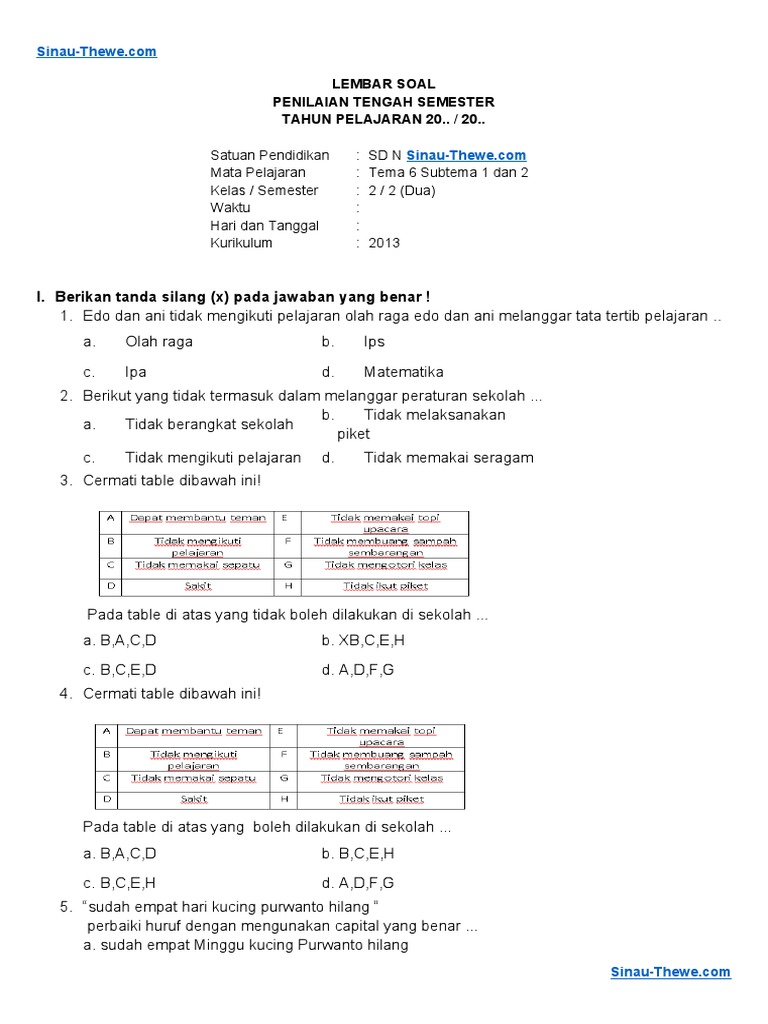 Soal u0026 Jawaban PTS Kelas 2 (Tema 6 Subtema 1 u0026 2) PDF